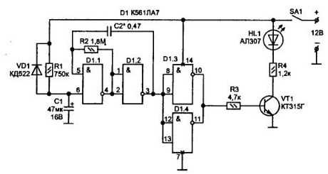 Единственный недостаток всех простых «мигалок» – они включаются сразу, что, скажем, для охранной системы автомобиля не характерно и может привести наблюдателя к выводу – обманка. Предлагаемые схемы не намного сложнее, но позволяют включить «охранную систему» с небольшой задержкой и создать полную иллюзию у наблюдателя, что вы вышли с объекта и поставили его под охрану.