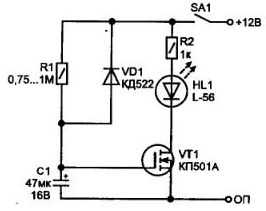 Если в вашем распоряжении оказался светодиод со встроенным генератором — «мигающий светодиод», то схема еще упрощается (рис.3). Здесь в качестве ключа используется полевой транзистор КП501А, а времязадающими элементами являются R1 и C1.