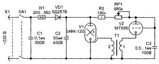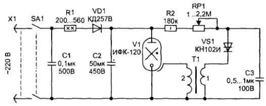 В схеме, изображенной на рис.1 в качестве генератора импульсов использован тиратрон тлеющего разряда МТХ-90. При подаче сетевого напряжения на розетку Х1, конденсатор С2 начнет заряжаться через токоограничивающий резистор R1 и выпрямительный диод VD1. Одновременно с ним пойдет заряд и конденсатора С3, но значительно медленнее, так как в цепи его зарядки стоят дополнительно R2 и RP1. Как только напряжение на С3 достигнет определенного значения (порядка 90 В), тиратрон откроется и импульс напряжения на первичной обмотке Т1 активирует лампу V1.