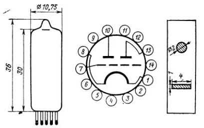 Вакуумная индикаторная люминесцентная лампа. Предназначена для визуального отображения знаков «тире» и «точка». Цвет свечения – зеленый, Катод – прямого накала, оксидный. Оформлена в стеклянный миниатюрный баллон, индикация – через боковую поверхность.