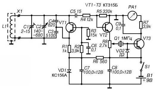 На месте VT1 – VT3 могут работать любые кремниевые маломощные транзисторы с возможно большим коэффициентом передачи, в качестве VD2 можно использовать любой германиевый диод серии Д2 или Д9. Кварцевый резонатор – любой с резонансной частотой 900 – 1100 кГц. Стрелочный прибор – любой, с током полного отклонения 1 мА. Источник питания – набор гальванических элементов или готовая батарея напряжением 7-10 В.