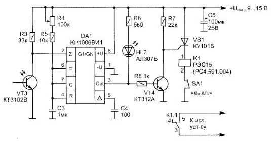 Чувствительность входа запуска Z таймера зависит от номинала резистора R3, который является нагрузкой фототранзистора VT3 – чем номинал выше, тем выше чувствительность приемника. Сам таймер DA1 включен по классической схеме детектора пропущенных импульсов. Пока на вход 2 микросхемы проходят импульсы с фотодатчика, таймер постоянно перезапускается, не закончив рабочий цикл. На его выходе Out постоянно высокий уровень. Транзистор VT4 открыт, тринистор VS1 закрыт, реле K1 обесточено.
