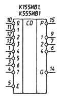 Микросхема К155 (К555)ИВ1 имеет восемь входов для подачи десятичного кода 1-7 (активный уровень низкий) и три выхода для вывода двоичного кода входного сигнала (активный уровень также низкий). При отсутствии входного кода (все уровни на выводах 1-4 и 10-13 высокие) на выводах 9, 7, 6 устанавливается высокий уровень, при появлении на любом из входов низкого уровня, на выходе устанавливается соответствующий номеру входа двоичный трехразрядный код. Одновременно на выходе G появляется «0» (сигнал наличия входного кода) и «1» на выходе Р, который используется для запрещения работы остальных шифраторов при их каскадном включении.