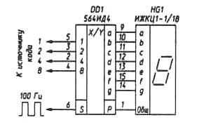 Имеет четырехразрядный вход данных и семь выходов для подключения семисегментного цифрового индикатора. Активные уровни входа и выхода высокие, но при необходимости могут инвертироваться сигналом по служебному входу S. При низком уровне на этом входе активный выходной сигнал высокий, при «1» на S – низкий. Это позволяет подключать цифровые матрицы как с общим анодом, так и с общим катодом без дополнительных инверторов. Еще один служебный вход К служит для управлением матрицы. «0» на входе К разрешает отображение, «1» гасит матрицу.
