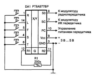 Комплект разработан для построения пятикомандных систем ДУ и позволяет передавать поочередно или параллельно до пяти независимых команд. Типовая схема включения шифратора команд PT8A977B представлена на рисунке 1.