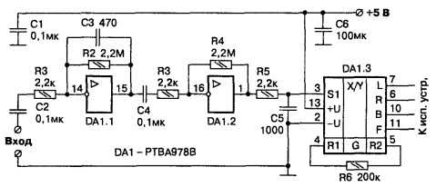 Для дешифрации команд, сформированных микросхемой PT8A977B, служит микросхема PT8A978B. Типовая схема ее включения изображена на рисунке 2. Тактовая частота дешифратора задается номиналом резистора R1 и выбирается равной тактовой частоте передатчика. На КМОП микросхеме DA1 (используются два инвертора) собран усилитель-формирователь, позволяющий подключить дешифратор непосредственно к выходу передатчика. Чувствительность усилителя – 10-30 мВ.