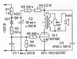 На тиратроне VL1 собран релаксационный генератор, который питается от сети через выпрямитель, собранный на диоде VD2. При этом конденсатор С2 выполняет роль и сглаживающего, и накопительного, обеспечивающего питание генератора при пропадании сетевого напряжения. Пока напряжение есть, происходит постоянная подпитка через цепь VD1R2 конденсатора С1, предотвращающая запуск генератора.