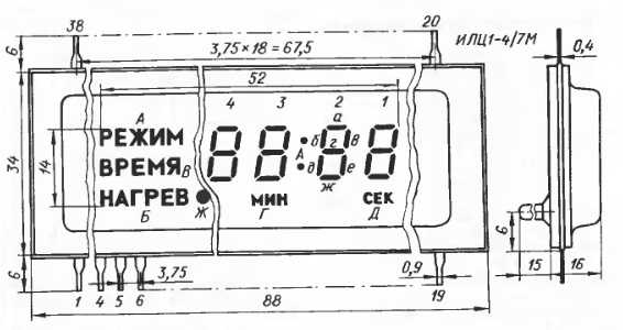 Оба индикатора имеют табло с надписями, мнемоническими знаками и четырьмя семисегментными разрядами. Размер цифровых символов – 10х5 мм. Оформлены в стеклянном плоском корпусе, выводы жесткие, луженые. Вес ИЛЦ1-4/7М – 40 г, ИЛЦ3-4/7М – 60 г.