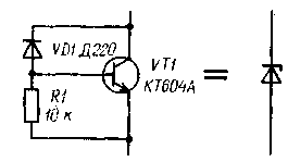 В устройстве могут быть применены диоды Д219А, Д220А, Д220, которые обладают низким дифференциальным сопротивлением при обратном напряжении 120-180 В. Налаживание аналога стабилитрона сводится к подбору экземпляра диода, обладающего необходимым напряжением стабилизации. При токе стабилизации более 6 мА транзистор придется установить на радиатор. В качестве VT1 может работать любой другой, имеющий соответствующее рабочее напряжение коллектор-эмиттер и рассеиваемую мощность.