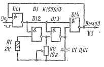 Схема, изображенная на рис.3 содержит еще два элемента, один из которых (D1.3) служит для более устойчивой работы генератора, а другой (D1.4) используется в качестве буферного для улучшения формы выходного сигнала. При указанных на схеме номиналах R1 и емкости конденсатора 0.047 мкФ частота следования импульсов будет равна 10 КГц.