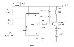 Электрическая схема прибора состоит из автогенератора, собранного на интегральном таймере 555 и усилителя мощности на транзисторе ВС557 в эмиттерную цепь которого включен токоограничивающий резистор. Конструктивно прибор выполнен аналогично обычному пульту ДУ, на крышке которого находятся выключатель питания и светоизлучающие диоды. Для блокировки, скажем, телевизора, достаточно направить излучатели «глушилки» в сторону его приемного окошка ДУ и включить тумблер питания.