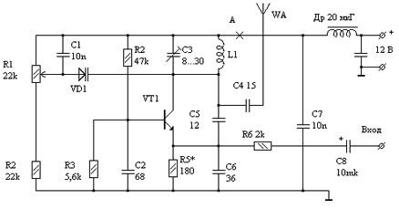 При нормальной работе задающего генератора схема потребляет ток порядка 25 — 30 мА (точка А). Во избежание паразитной модуляции схему лучше питать от стабилизированного источника. Конструкция антенны жесткая (штырь, телескопическая антенна от радиоприемника), плата передатчика помещена в экранирующий корпус. На месте VT1 хорошо работает КТ608Б.