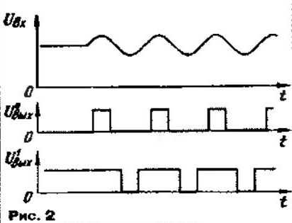 Основным узлом извещателя и, собственно, датчиком служит доработанная головка микроамперметра М476/1, используемая в качестве индикатора записи в кассетных и катушечных магнитофонах (конечно, пойдет и любая другая, с близкими характеристиками). Когда стрелка прибора неподвижна, напряжение на его выходе равно нулю. Стоит чуть качнуть стрелку, как на обмотке появится наведенное напряжение (рис.2), которое поступает на усилитель, выполненный на компараторе К554СА3.