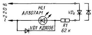 Поскольку выпрямительные столбы имеют достаточно высокое прямое падение напряжения (для КЦ106А – КЦ106Д, к примеру, оно составляет порядка 20-25 В при токе 10 мА), проверить их исправность путем прозвонки обычным тестером не удастся. Тем не менее, проверить такой столб несложно, собрав простейший индикатор, изображенный ниже.