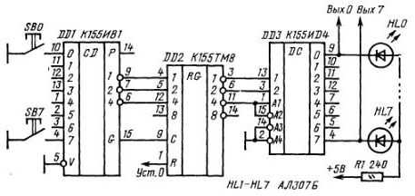 Интересную и несложную схему переключателя с зависимой фиксацией можно построить на микросхеме К155ТМ8 (рис.6).