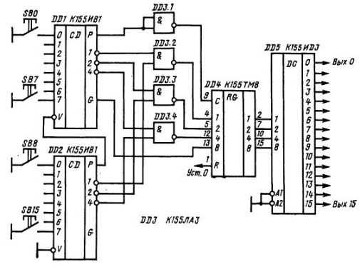 Схема, конечно, с виду достаточно громоздка, но фактически состоит лишь из трех корпусов без дополнительных навесных элементов и, что немаловажно, не требует кнопок на переключение. При нажатии на кнопку, приоритетный шифратор DD1 устанавливает на своем выходе двоичный код (инверсный) этой кнопки и подтверждает его сигналом G «строб», который тут же записывает данные в микросхему DD2, работающую в режиме четырехразрядного параллельного регистра-защелки. Здесь код еще раз инвертируется (выходы у регистра инверсные) и поступает на обычный двоично-десятичный дешифратор DD3. Таким образом, на соответствующем выходе дешифратора устанавливается низкий уровень, который будет неизменным до нажатия любой другой кнопки. Невозможность одновременного защелкивания двух кнопок обеспечивает схема приоритета (подробнее о работе приоритетного шифратора я писал здесь). Поскольку микросхема К155ИВ1 прямо таки создана для наращивания разрядности, было бы глупо не воспользоваться этим и не собрать блок переключателей с зависимой фиксацией на 16 кнопок (рис.8).