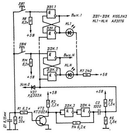Транзистор тут же переключит триггер Шмидта на элементах DK.3, DK.4, который сформирует короткий импульс на входах сброса всех триггеров. Все триггеры будут сброшены (если до этого были включены), кроме первого, поскольку через кнопку SB1 на его верхний по схеме вход все еще подается логический «0» (напряжение ниже 1 В). Таким образом, задержка прохождения сигнала сброса достаточна для прекращения дребезга контактов, но сброс произойдет быстрее, чем мы отпустим кнопку, запрещающую переключение соответствующего триггера.