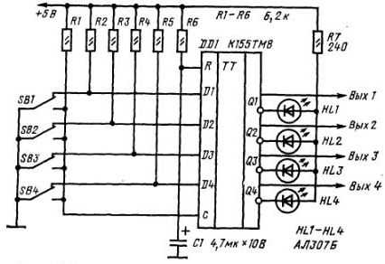 При подаче питания цепочка R6, С1 сбрасывает все триггеры и на их прямых выходах устанавливается низкий логический уровень. На входах D так же уровень низкий, поскольку все они замкнуты каждый через свою кнопку на общий провод. Предположим нажата кнопка SB1. На входе первого триггера устанавливается «1» (благодаря R1), на общем тактирующем входе – «0» (через переключающий контакт кнопки). Пока теоретически ничего не происходит, поскольку микросхема стробирует данные по положительному перепаду. А вот при отпускании кнопки данные со входов будут переписаны в триггеры – в 2, 3, 4 – «0», в 1 – «1», поскольку положительный фронт на входе С появится раньше, чем верхние по схеме контакты SB1 замкнутся. При нажатии любой другой кнопки цикл повторится, но «1» будет записана в тот триггер, чья кнопка будет нажата. Это в теории. Практически из-за дребезга контактов данные с входа перепишутся сразу после нажатия кнопки и по отпусканию ее не изменятся.