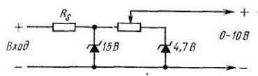 Стабилитроны можно также использовать и для реализации регулируемого стабилизатора напряжения, подобная схема изображена ниже: