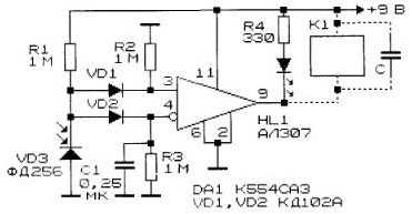 Компаратор сработает и включит исполнительное устройство К1 (к примеру, реле, запускающее звуковой извещатель тревоги). Переключая конденсатор на тот или иной вход компаратора, схема может быть настроена на понижение или повышение освещенности.