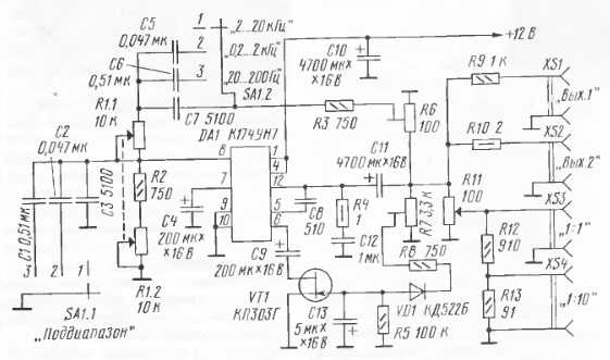 Генератор построен по классической схеме Вина с положительной обратной связью, образованной цепью R1R3С3С7. Для переключения диапазонов используется переключатель SA1, подключающий к цепи дополнительные конденсаторы С1, С2, С5, С6. При этом глубина положительой обратной связи может регулироваться резистором R6. Для плавного изменения чатоты внутри выбранного диапазона служит резистор R1. Для стабилизации амплитуды выходного сигнала при изменении частоты генератора служит узел стабилизации, собранный на элементах VT1, С9, С13, R5, VD1, R8, R7.