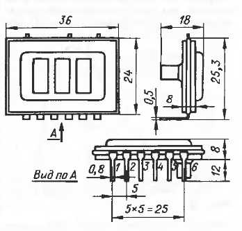Одноразрядный вакуумный люминесцентный индикатор с полем, состоящим из трех расположенных в ряд элементов прямоугольной формы. Цвет элементов – зеленый, желтый и красный. Корпус прямоугольный, плоский, выполнен из стекла с жесткими лужеными выводами. Масса прибора – 15 г.