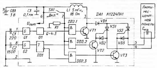 Микросхема К1224ПН1 представляет собой преобразователь низкого постоянного напряжения в высокое переменное и предназначена для питания плоских люминесцентных панелей в носимой аппаратуре с напряжением питания 2.5…5 В. Микросхема имеет практически все узлы и элементы преобразователя кроме накопительного дросселя и частотозадающих конденсаторов. Предусмотрен дежурный режим, при котором микросхема подключена к источнику питания, но высокое напряжение не вырабатывает и практически не потребляет энергии. Прибор выполнен в пластмассовом корпусе 2101.8-2, ближайший функциональный аналог – SP4424 компании Sipex.