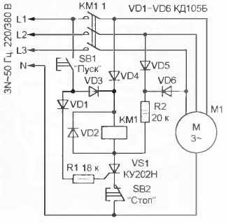 Поскольку контакты пускателя замкнулись (двигатель М1 запущен), тиристор остается открытым и при отпускании кнопки SB1 — напряжение на него начинает поступать через диод VD4. Чтобы он не закрылся по окончании периода фазы L1, в цепь анода введена цепочка VD5 VD6 R2. Благодаря ей ток через тиристор не прерывается и он остается открытым постоянно при наличии всех трех фаз. Как только пропадет одна из фаз, непрерывность анодного тока тиристора нарушается и он закрывается. Пускатель аварийно отключает электродвигатель. Остановить двигатель вручную можно нажатием на кнопку SB2.
