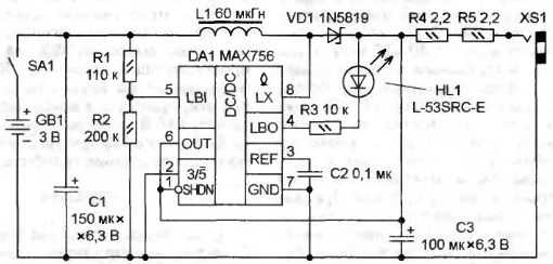 В конструкции можно использовать резисторы МЛТ, конденсаторы С1 и С3 лучше взять танталовые, С2 – керамический. Вместо 1N5817 (диод Шотки, VD1) подойдет 1N5817, 1N5818. Светодиод любой с минимальным током свечения, но, конечно, под него придется подобрать номинал токоограничивающего резистора R3. Дроссель L1 имеет индуктивность 40-90 мкГн и выдерживает импульсный ток до 1.2 А. Для его самостоятельного изготовления понадобится ферритовое кольцо типоразмера К10х4х5, которое нужно разломить пополам, а затем вновь склеить, проложив в зазоры прокладки из бумаги толщиной 0.5 мм. На доработанное кольцо наматывается провод диаметром 0.25…0.31 в один слой виток к витку до заполнения.